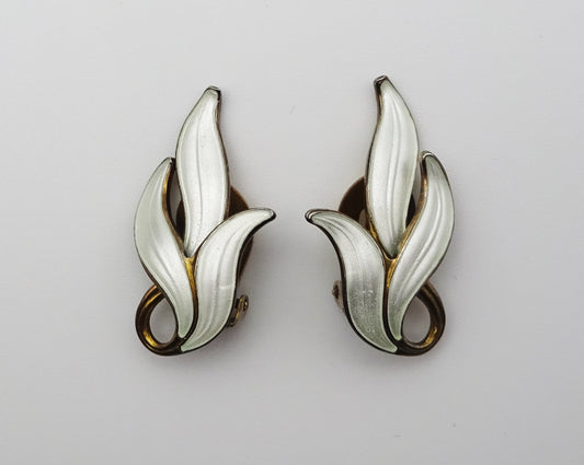 Scandinavian Silver Gilt and White Enamel Leaf Clip On Earrings