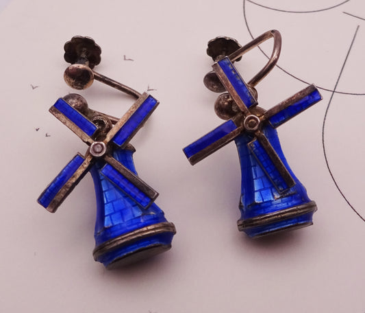 Scandinavian Silver and Blue Enamel Windmill Screwback Earrings